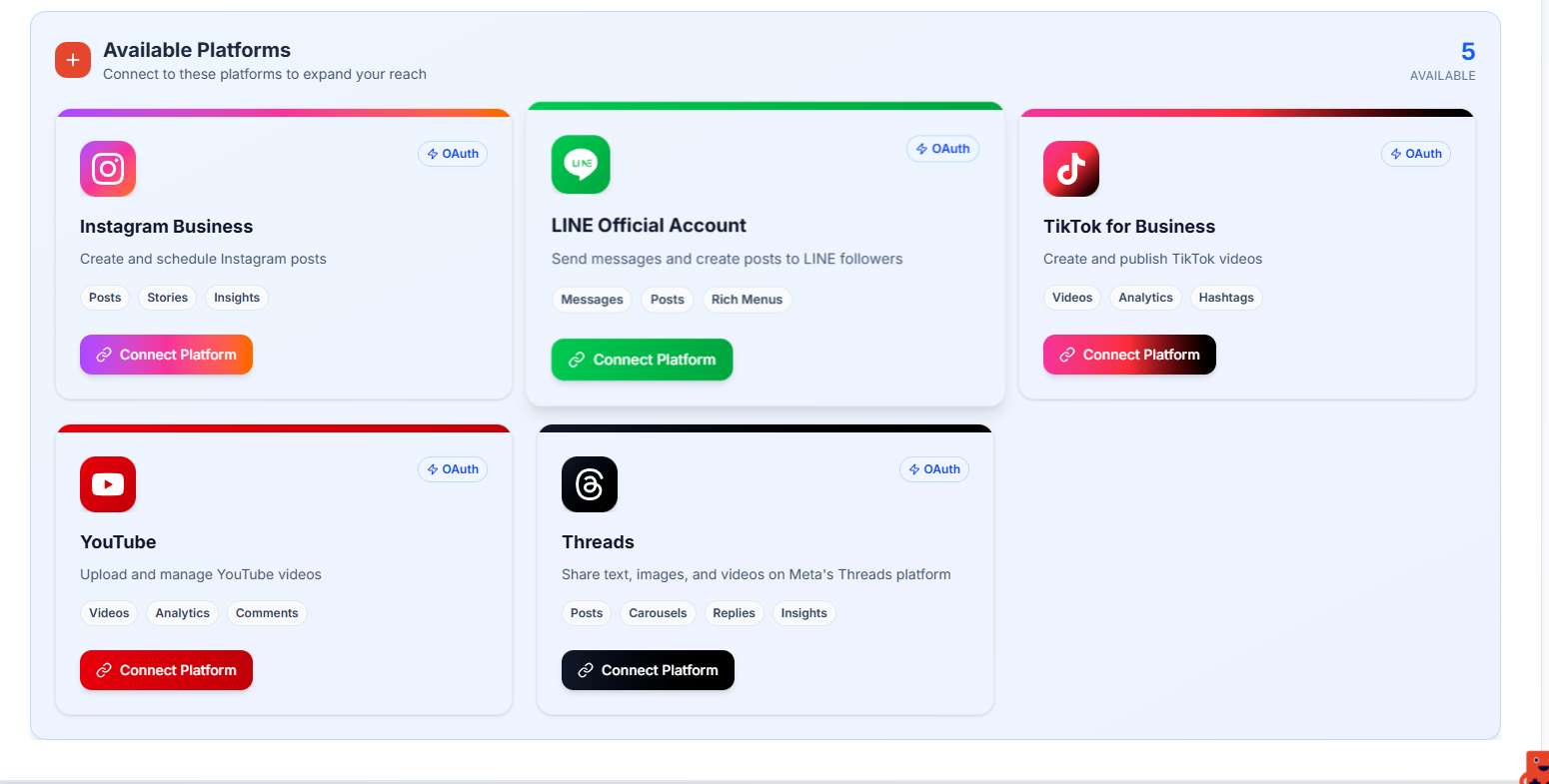 You will see a list of available social media platforms. Choose the platform you want to connect (e.g., Instagram, LINE, TikTok, YouTube, Threads) and click the "Connect Platform" button below it.
