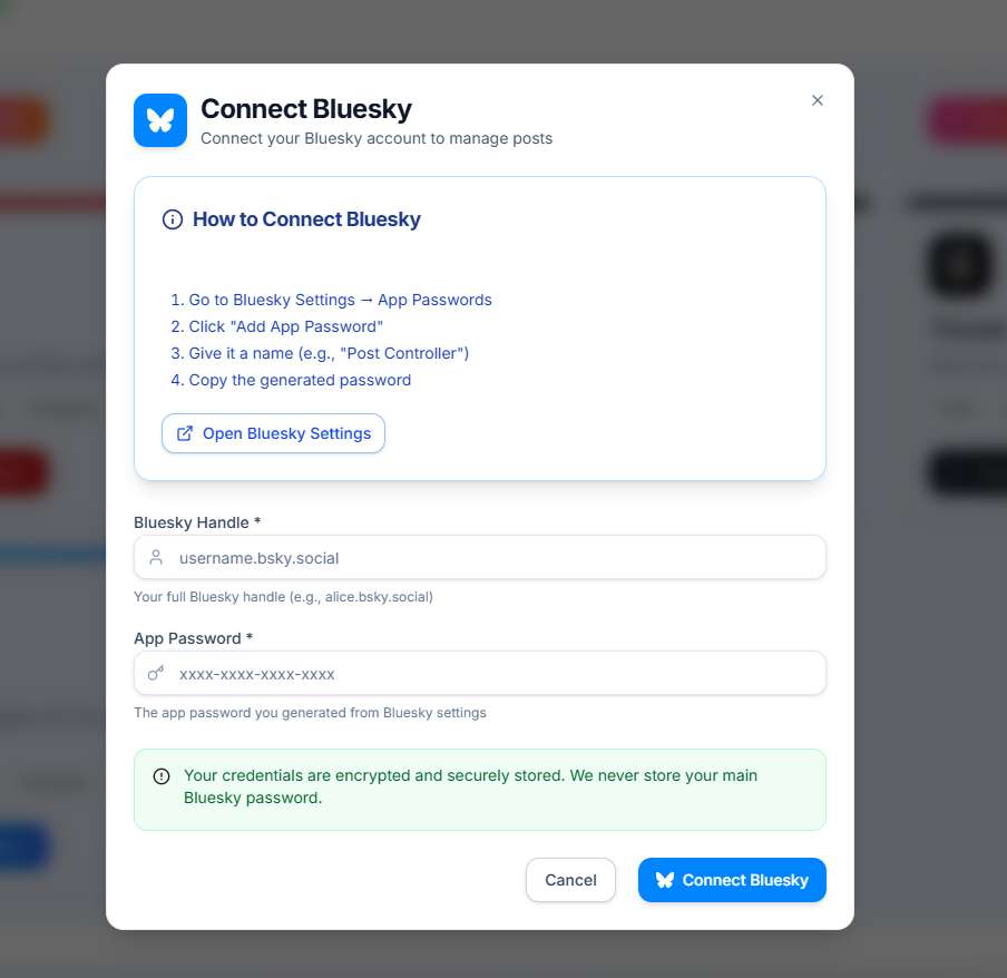 For Bluesky, you need to generate an App Password from your Bluesky account settings (not your main password). Click "Connect" for Bluesky, then enter your Bluesky handle (e.g., username.bsky.social) and the App Password. Never use your main account password for security reasons.