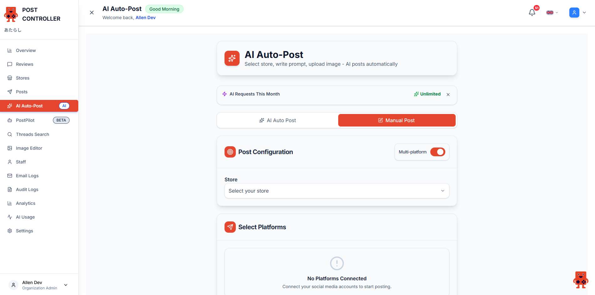 Multi-Platform Toggle: Enable "Multi-platform" mode to post the same content to all selected platforms at once