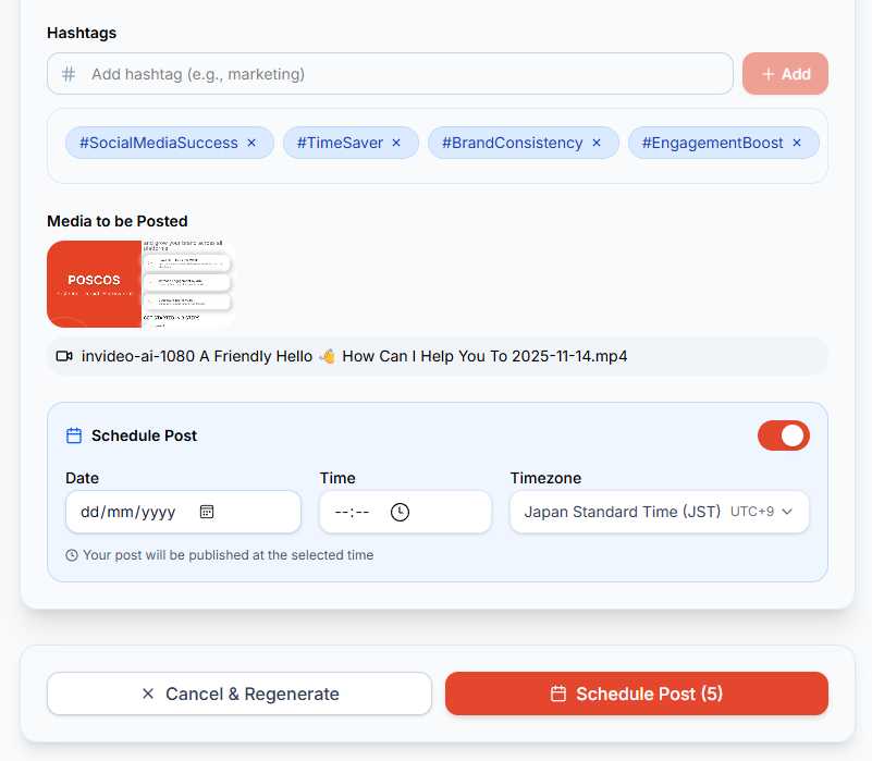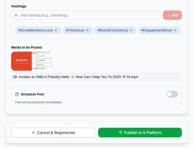Schedule Posts: Mention time in your prompt (e.g., "tomorrow at 3pm") to automatically schedule posts