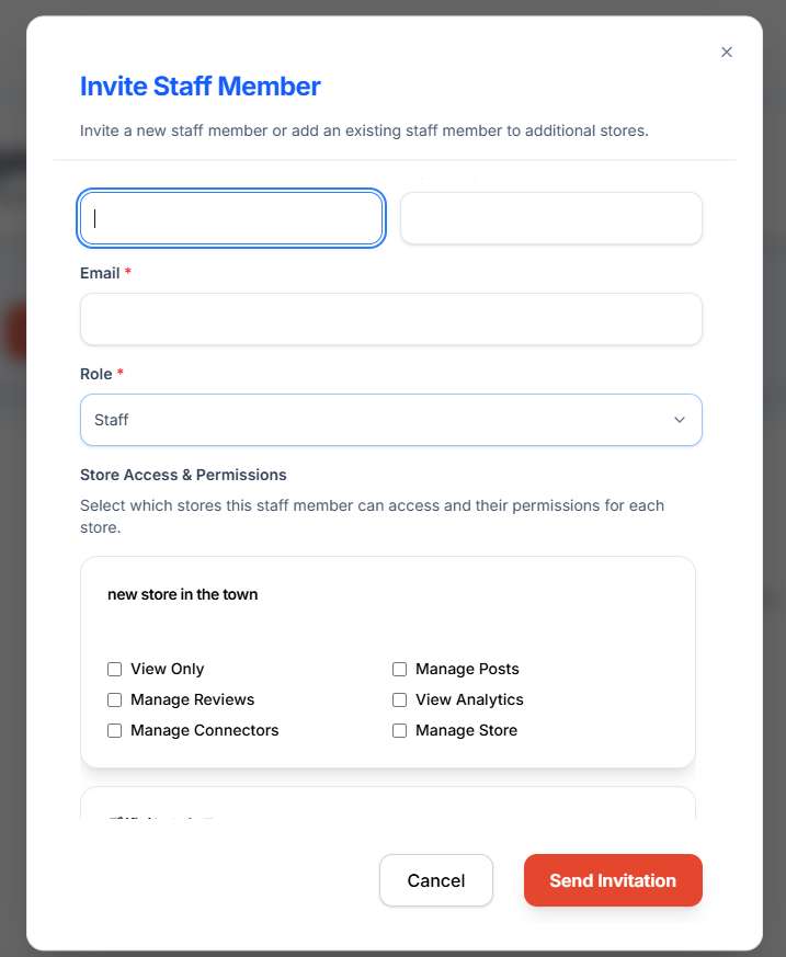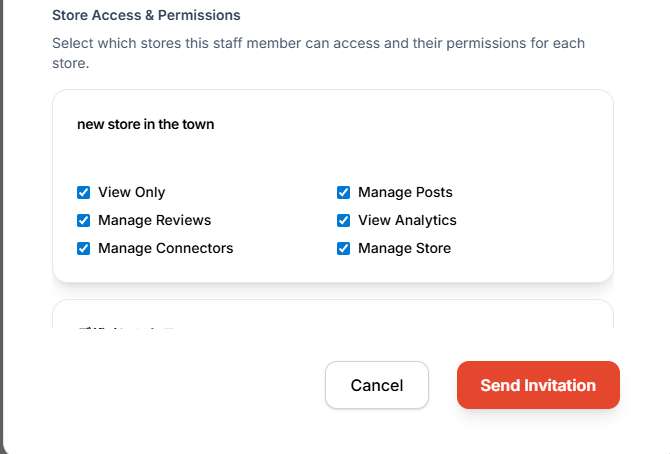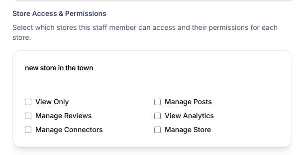 Choose what level of access the staff member should have. You can grant them full admin access or limit their permissions to specific features. You can also set different permissions for each store, allowing granular control over what staff members can access.