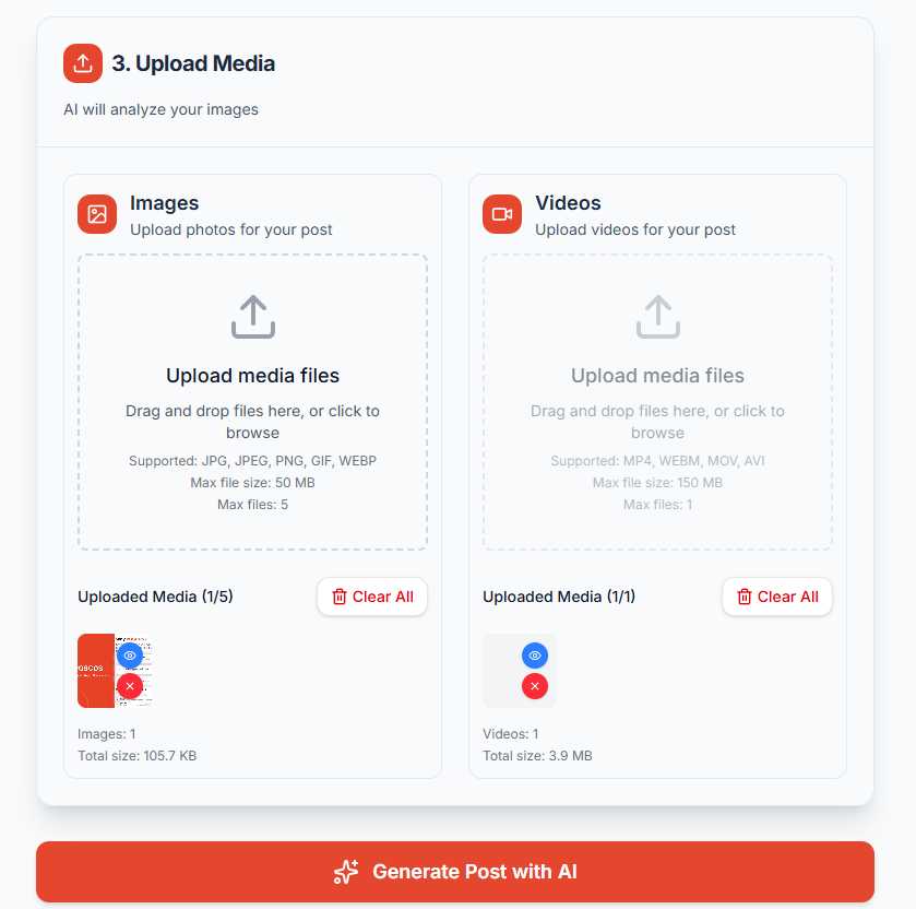 Upload images or videos for your post. AI will analyze them and generate appropriate captions.