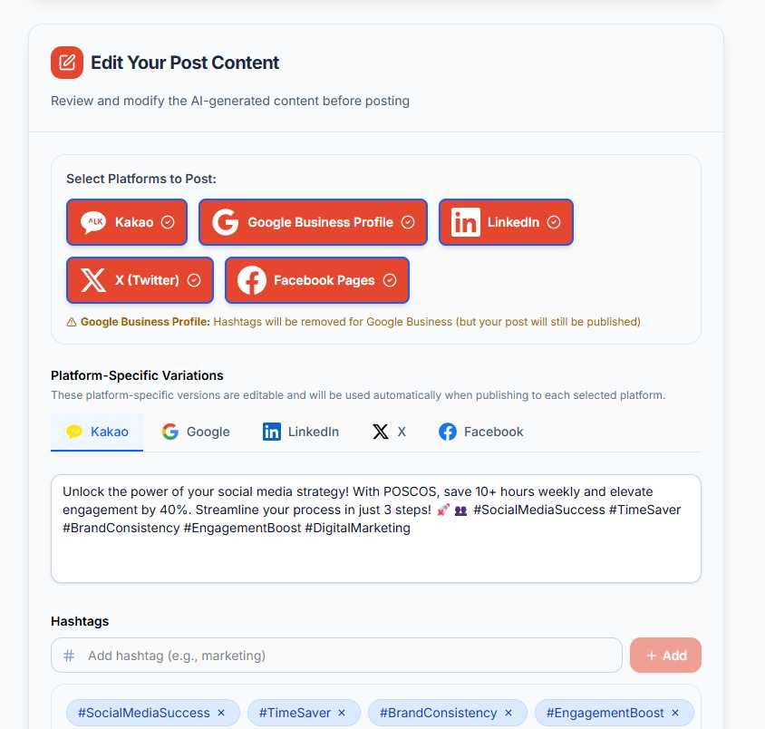 Choose which social media platforms to post on. Edit platform-specific content if needed.